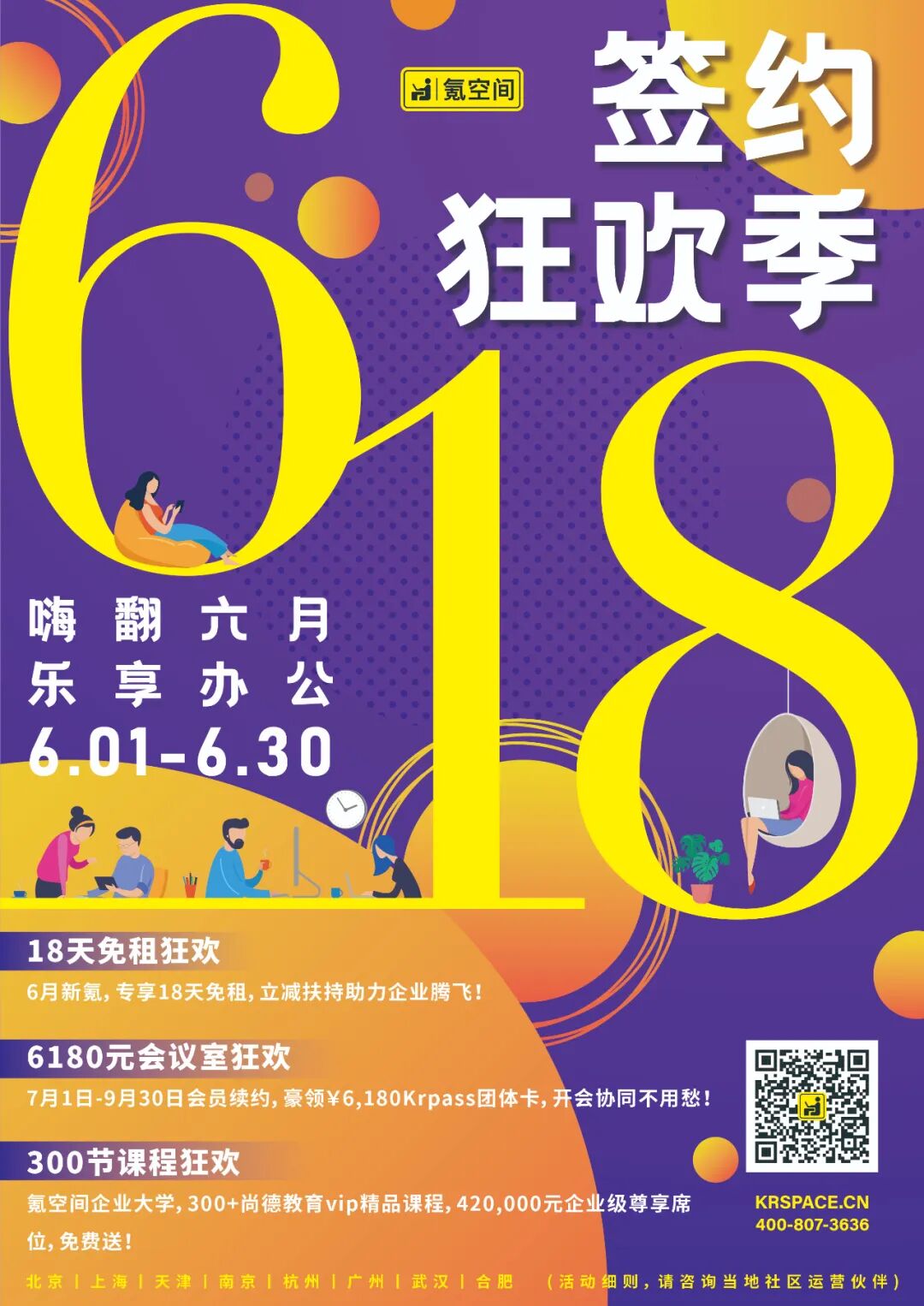 创业不易,资金能省一笔是一笔,6.18别剁手了,不如来氪空间狂欢一下!氪空间618签约狂欢季,省的就是你!快来参与我们的嗨翻六月、乐享办公福利活动吧!