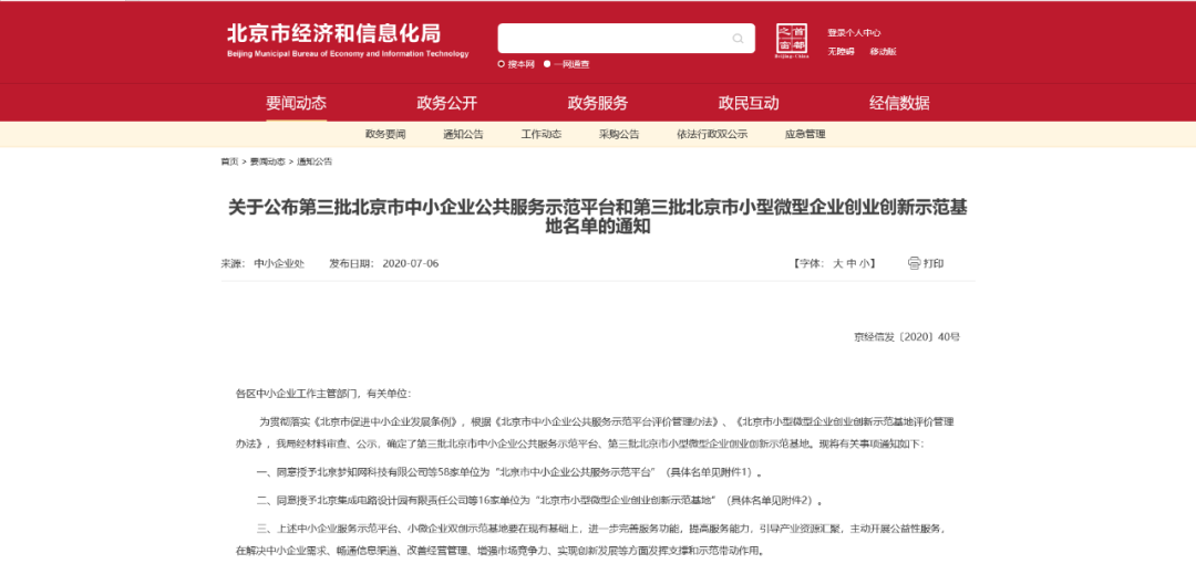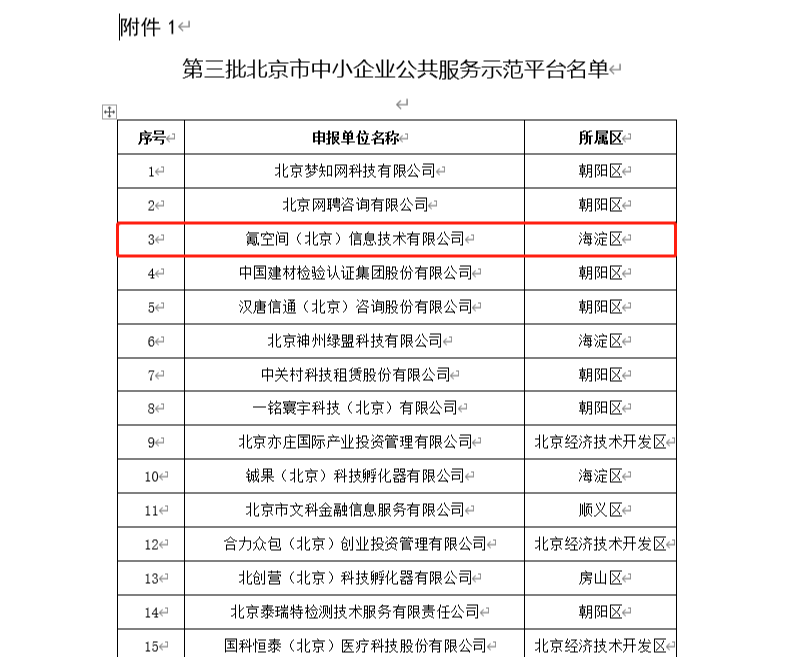 2020年7月6日,北京市经济和信息化局公布了第三批北京市中小企业公共服务示范平台名单,氪空间(北京)信息技术有限公司被授予“北京市中小企业公共服务示范平台”称号。本次申报工作于2020年1月6日启动,经单位自主申报,各区县中小企业工作主管部门初审、推荐,市经信局组织专家进行评审、公示,氪空间等58家单位被认定为第三批北京市中小企业公共服务示范平台。