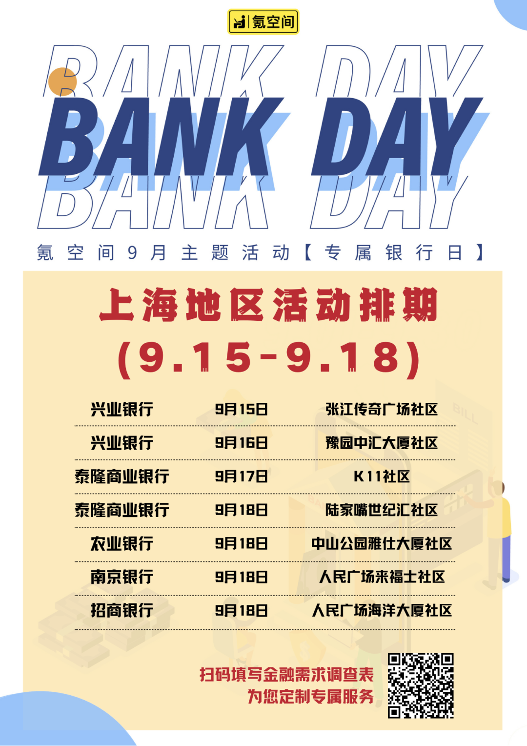 魄体乳酸蛋白水畅饮 北京-朝阳门兆泰国际社区 9月15日 13:00-15:00 & 北京-国贸大都会社区 9月17日 13:00-15:00 收纳艺术整理课程 北京-国贸海航实业大厦社区 9月16日 13:30-15:00 我要送你一束花 9月16日 12:00-13:00 上海-人民广场海洋大厦社区 送你一束花,就是送给你春天般的美好。 送你一束花,就是送给你我的牵挂与祝福。 送你一束花,希望生活如鲜花般美妙多姿。 氪空间&花钰 我要送你一束花 期待与您相遇 Bank Day 武汉-街道口科创大厦社区 9月16日 11:00-17:00 9月主题活动“Bank Day” 即将在武汉-街道口科创大厦社区开启 招商银行工作人员来到社区 为您提供专业的VIP服务 足不出户就能办理个人&公司业务 武汉-街道口科创大厦社区的会员们 不要错过这次福利哦! Tips: 提前准备好需要办理的业务及相关资料 享受便捷的服务与超高的效率吧 北京其他社区排期如下: 北京-国贸海航实业大厦社区 9月17日 11:00-17:00 交通银行 北京-国贸中海广场社区 9月18日 11:00-17:00 上海地区排期如下: 小鱼水果试吃 北京-金融街海峡国际社区 9月18日 12:00-14:00 甜蜜的水果,为你的工作日增加一点滋味。 清爽口感扫去工作压力,充满能量再出发。 【第三期】财商课堂 富爸爸现金流游戏 广州-TIT创意园社区 9月19日 13:30-17:30 人的一生都离不开与金钱打交道 如何规划和使用金钱,是一门重要的课题。 9月19日,氪空间财商课堂开启 提升正确认识财富以及财富倍增的能力 让你的财商更上一层楼吧