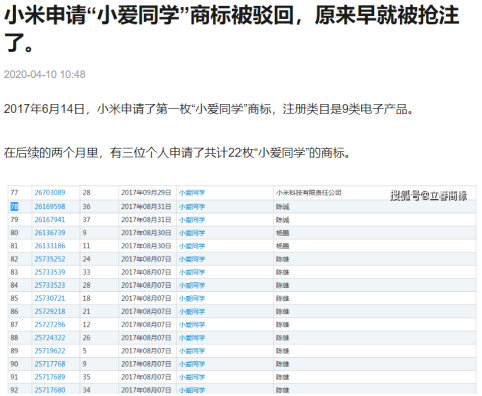 前有B站百万UP敬汉卿商标被抢注引发商标注册地震,后有小米小爱同学申请商标被驳回。