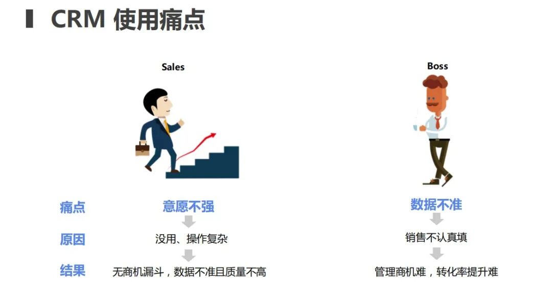 调研发现,市场上有很多CRM产品,但国内真正用起来的团队却是少数。由于CRM的数据主要是由销售人员手动录入,销售如果不会录、不认真录,那么CRM自然管理不起来,管理者也会很焦虑。